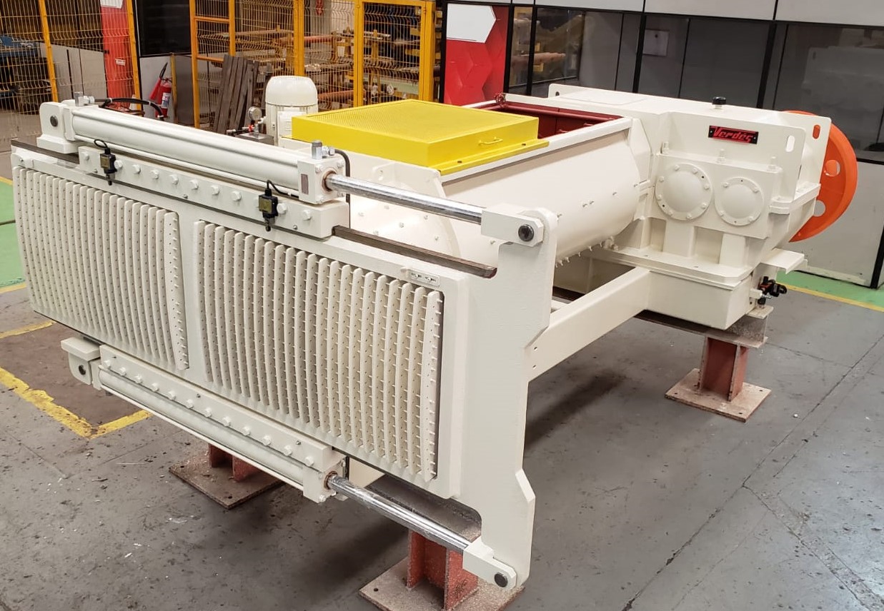 Este material processado e homogeneizado e introduzido no processo de trituração secundaria, composto por alimentador 027P, destorroador 116DT, desintegrador 124B, laminador de desbaste 083EU, misturador extrusor 047DE onde se realiza a introdução de barrilha no processo de ativação.